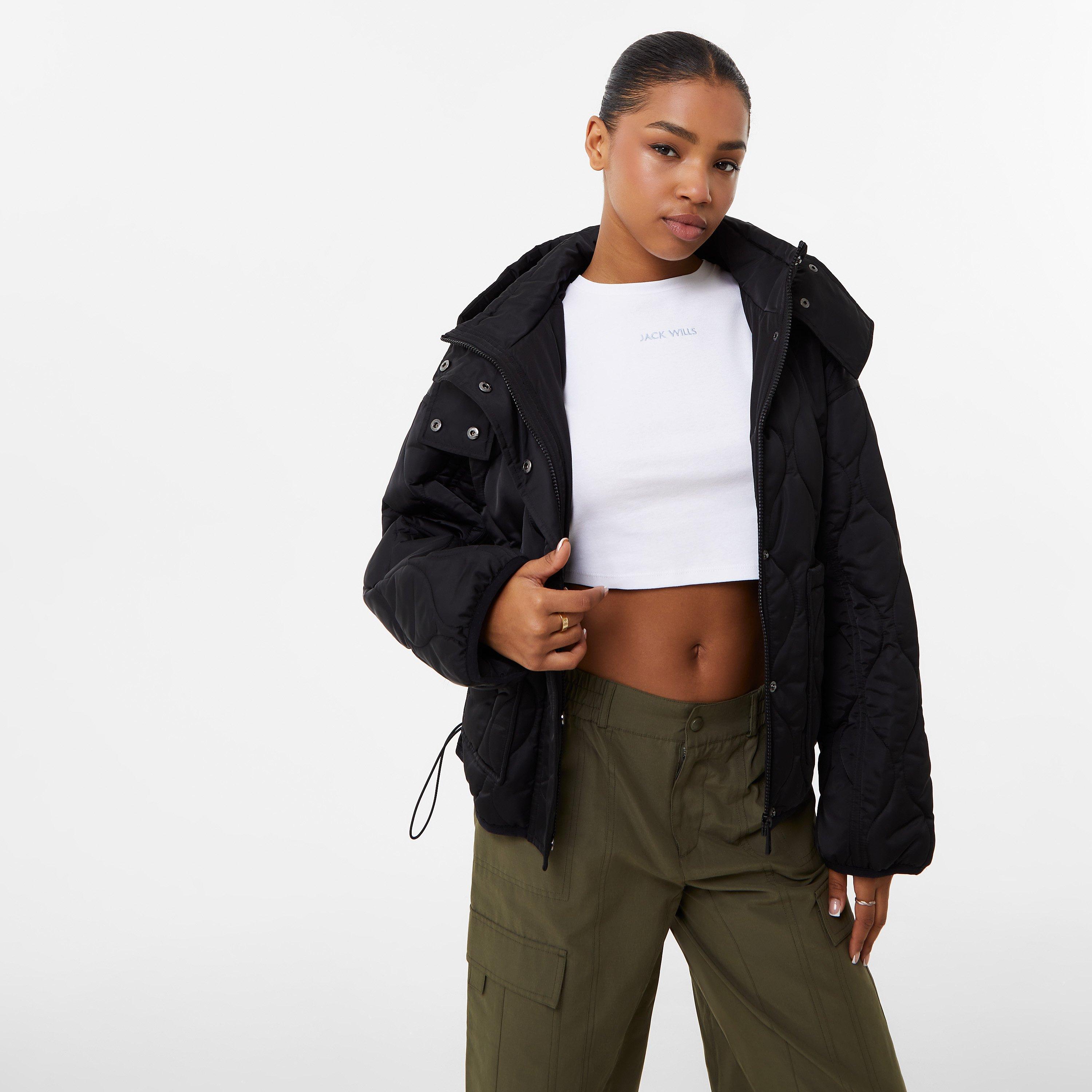 O Casaco Puffer Curto Boxy Acolchoado de Manga Longa da Jack Wills para Mulheres oferece calor e estilo diário. Este puffer curto apresenta um padrão acolchoado por toda a parte com fecho central de zíper e aba de tempestade com botão de pressão para máxima proteção contra o clima, enquanto o capuz fixo e a borda ajustável por cordão proporcionam cobertura personalizável.